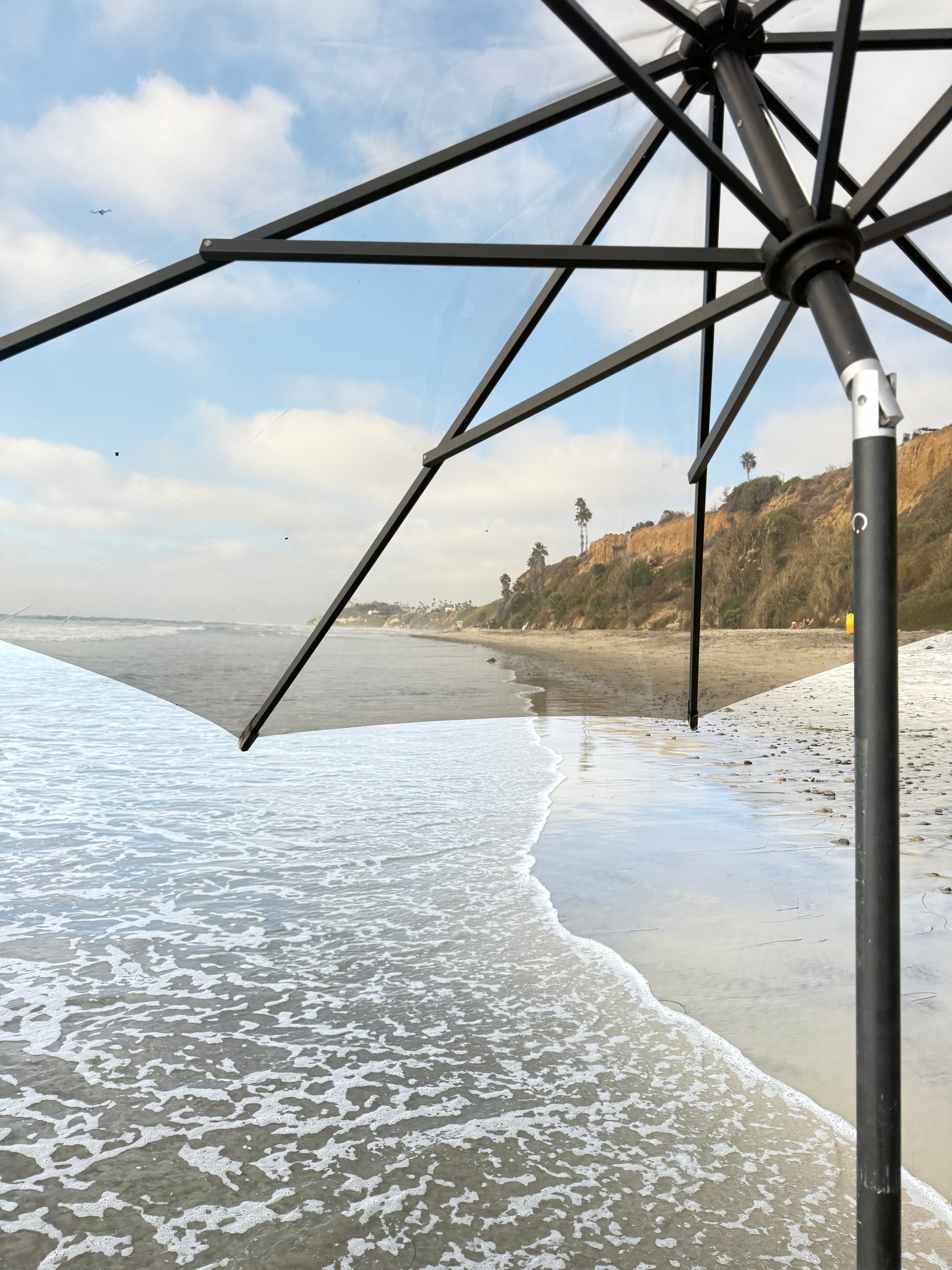 A clear, UV-filtering canopy that softens sunlight and maintains brightness — unlike dark shade umbrellas that block the sky and create harsh shadows.